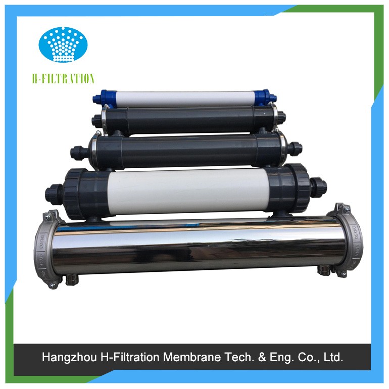 本品為外壓式超濾膜組件,根據膜組件外壁的箭頭方向,箭頭指向的端口是超濾透過液出口,下端是原液進口,側面兩個端口是排濃(回流)口;